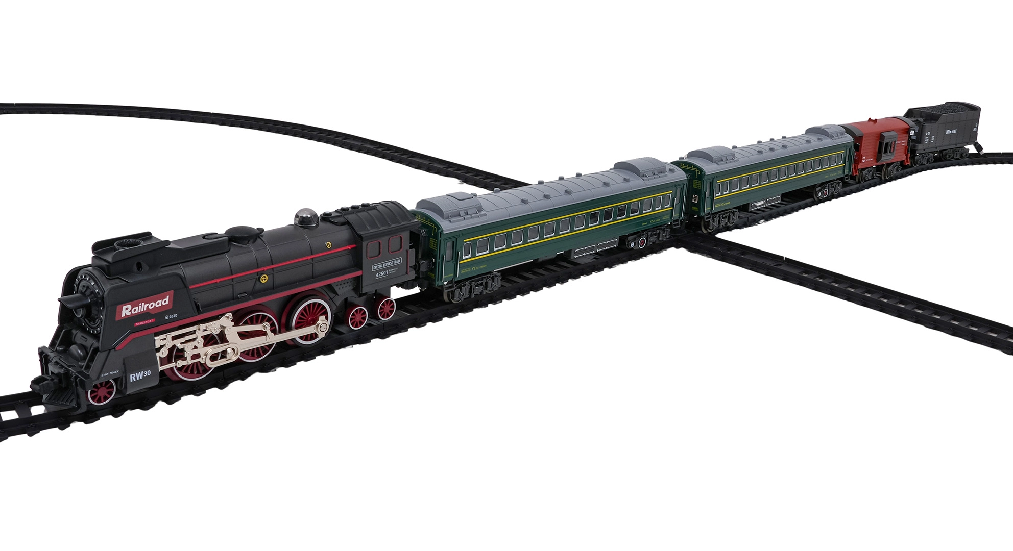 Súčasťou je lokomotíva, tender s uhlím, dva zelené osobné vozne a červený nákladný vozeň. Každý diel má funkčné spriahadlá a realistické detaily pre pútavú hru.