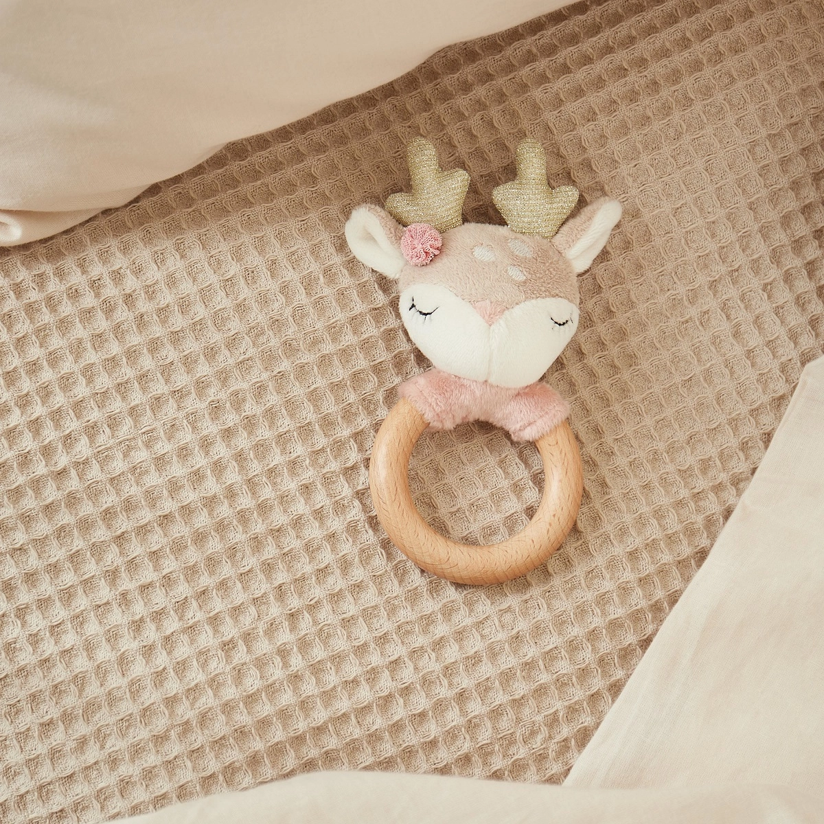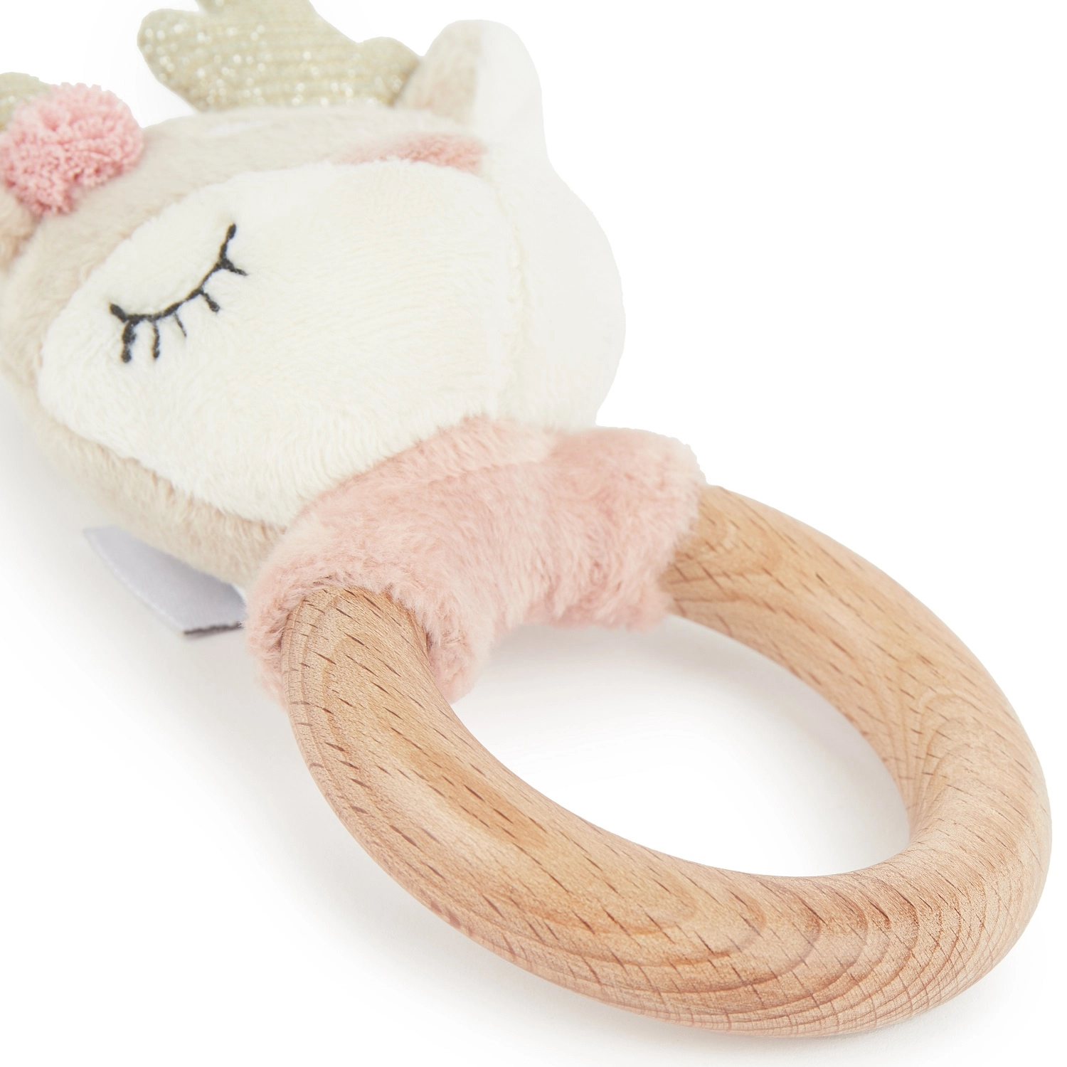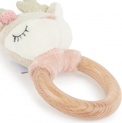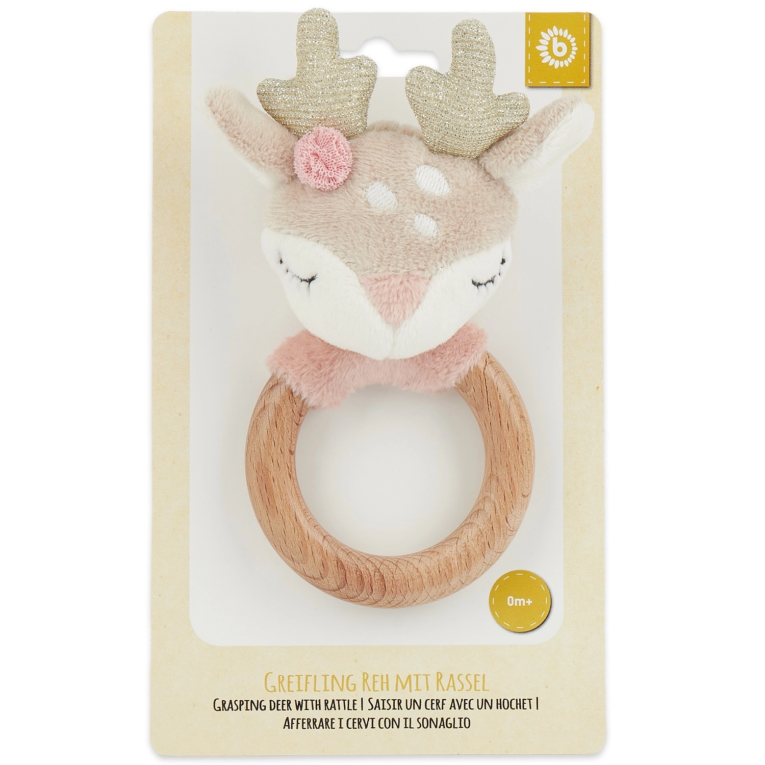 Táto multifunkčná motorická hračka spája tri obľúbené funkcie – hrkálka, uchopovaciu hračku a hryzátko. Drevený krúžok je hladký, príjemný do ruky a vhodný na hryzenie, zatiaľ čo hebká plyšová hlavička kolouška ponúka upokojujúci dotykový vnem. Jemné hrkanie prirodzene podnecuje zvedavosť a rozvíja koordináciu oko–ruka.