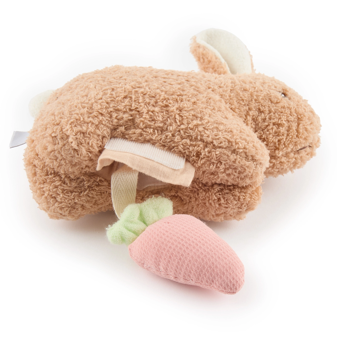 Vyberateľná mrkvička v brušku zajačika jemne šuští pri stlačení a motivuje bábätko k skúmaniu, uchopovaniu a opakovanému objavovaniu.
