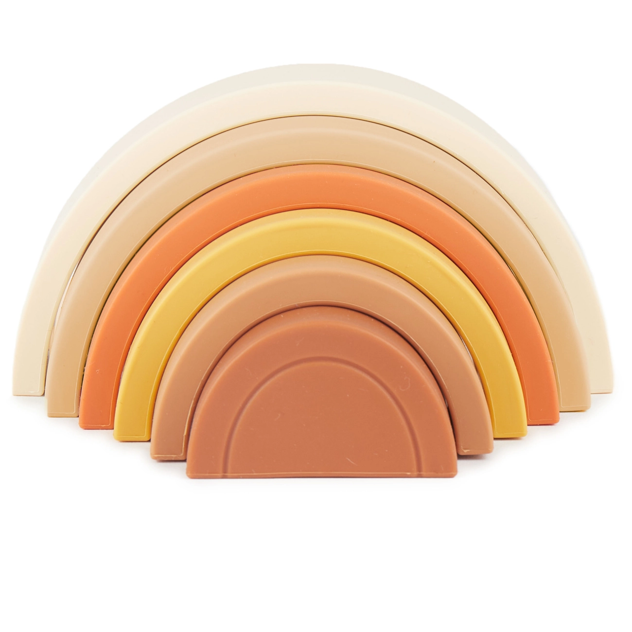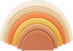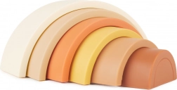 Štýlová silikónová dúha Bieco v zemitej palete je ideálna hračka pre batoľatá. Podporuje jemnú motoriku, koordináciu oko–ruka a rozlišovanie farieb a veľkostí. Mäkký 100% silikón je bezpečný, odolný a ľahko umývateľný, takže sa hodí do vane, bazéna aj na pláž.