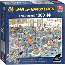 Objavujte svet plný humoru s puzzle JUMBO Jan van Haasteren – Mačacia prehliadka. Autor je známy svojím výrazným štýlom, kde nechýbajú pestré detaily, veselé situácie a množstvo postáv, ktoré vás pobavia pri každom skladaní. Skúsení fanúšikovia budú hľadať ikonické prvky ako žraločia plutva, túlajúce sa ruky, zubná protéza, Mikuláš a dokonca aj autorov portrét.