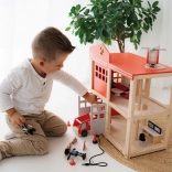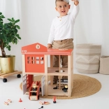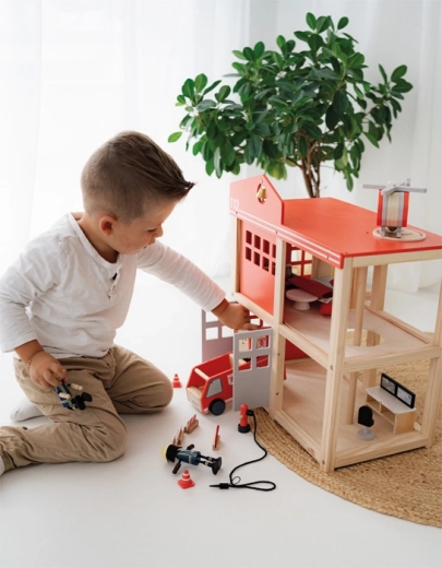 Veľká drevená hasičská stanica od Small foot je premyslený herný set pre malých hrdinov. Ponúka dve poschodia s velínom, oddychovou zónou a dielňou, priestorom na parkovanie vozidla aj pristávacou plochou pre vrtuľník. Otvorená konštrukcia a veľké dvere zaisťujú pohodlný prístup do všetkých kútov stanice.