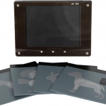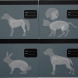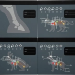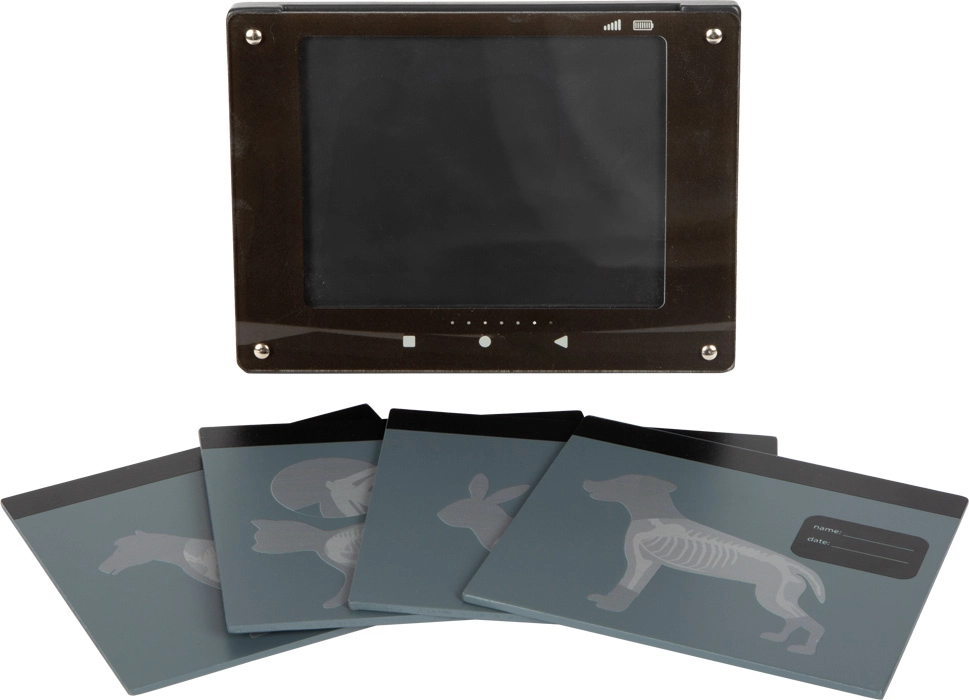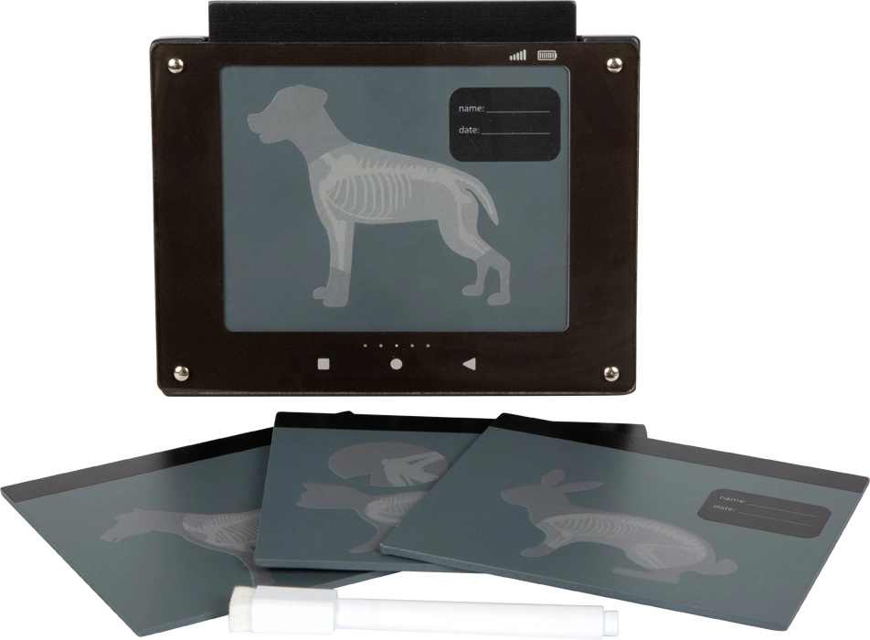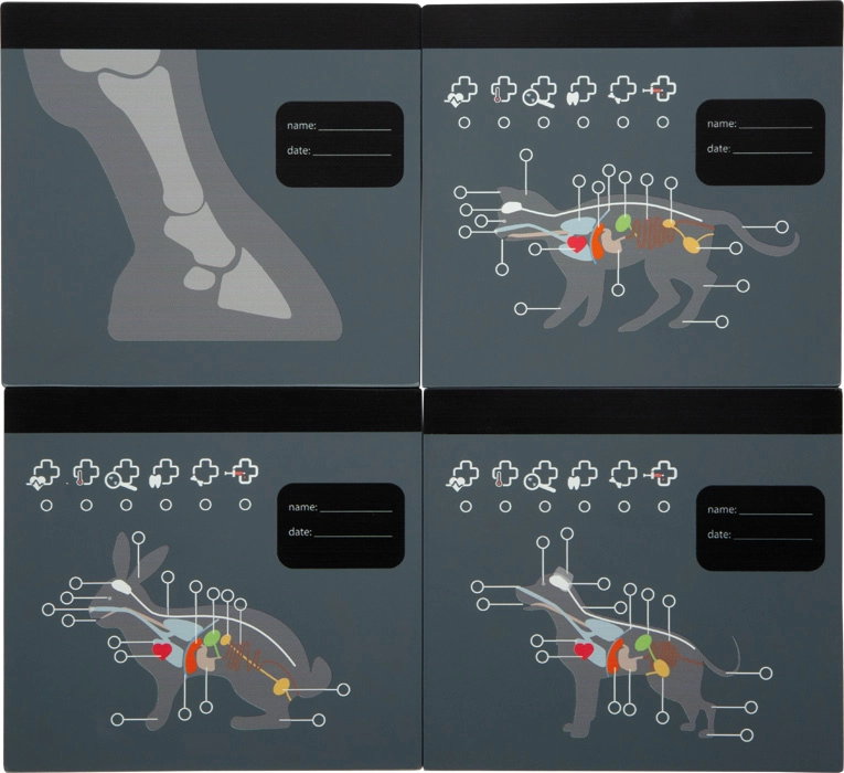 Interaktívny „röntgen“ s priesvitnými kartami zvierat (pes, mačka, zajačik, kôň) podporuje predstavivosť a vysvetľuje stavbu tela hravou formou. Zapisovacie pole umožní meno pacienta a dátum vyšetrenia.