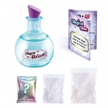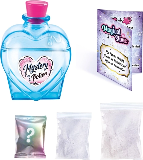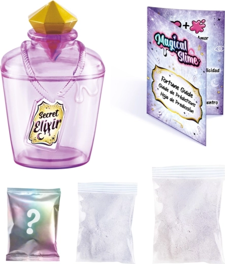 - Fľaštička v tvare elixíru, zmesi práškov na sliz, trblietky/konfety, karta predpovedí, návod