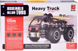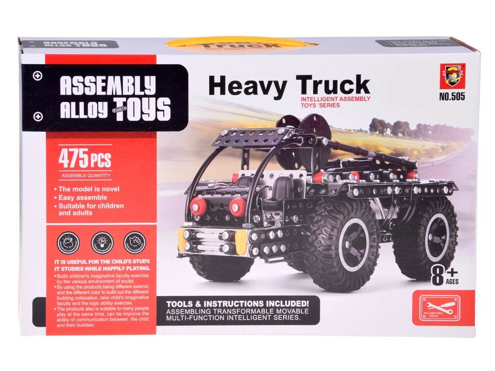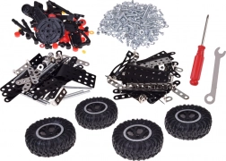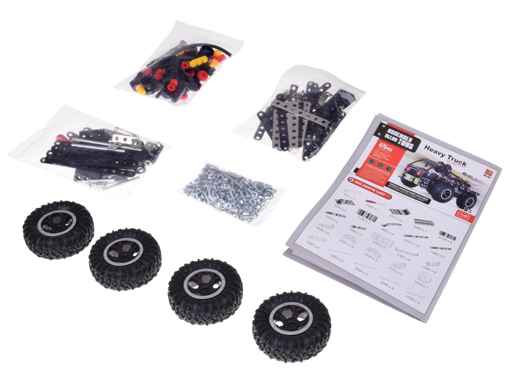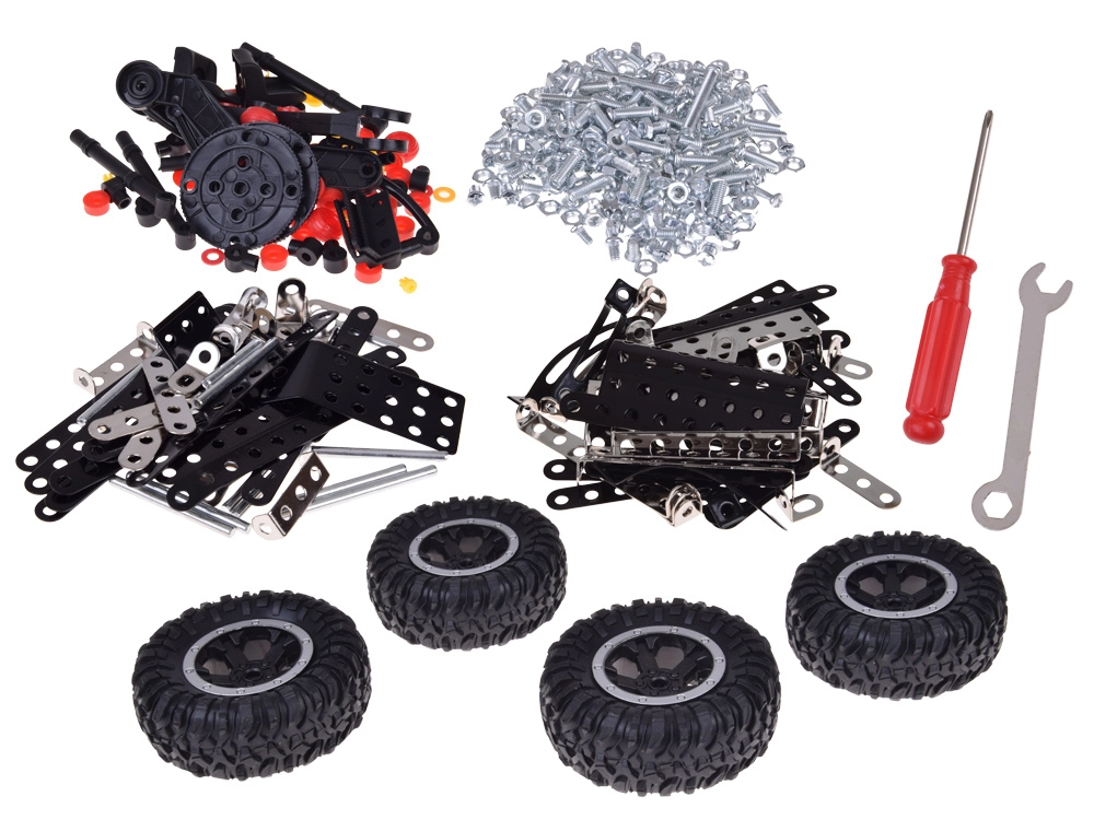 Všetko potrebné v jednej krabici: 475 dielov, gumové pneumatiky, plastové doplnky, skrutky a matice, skrutkovač, kľúč a obrázkový návod.