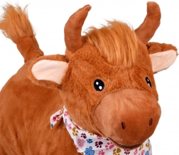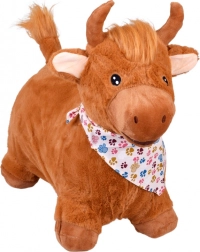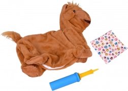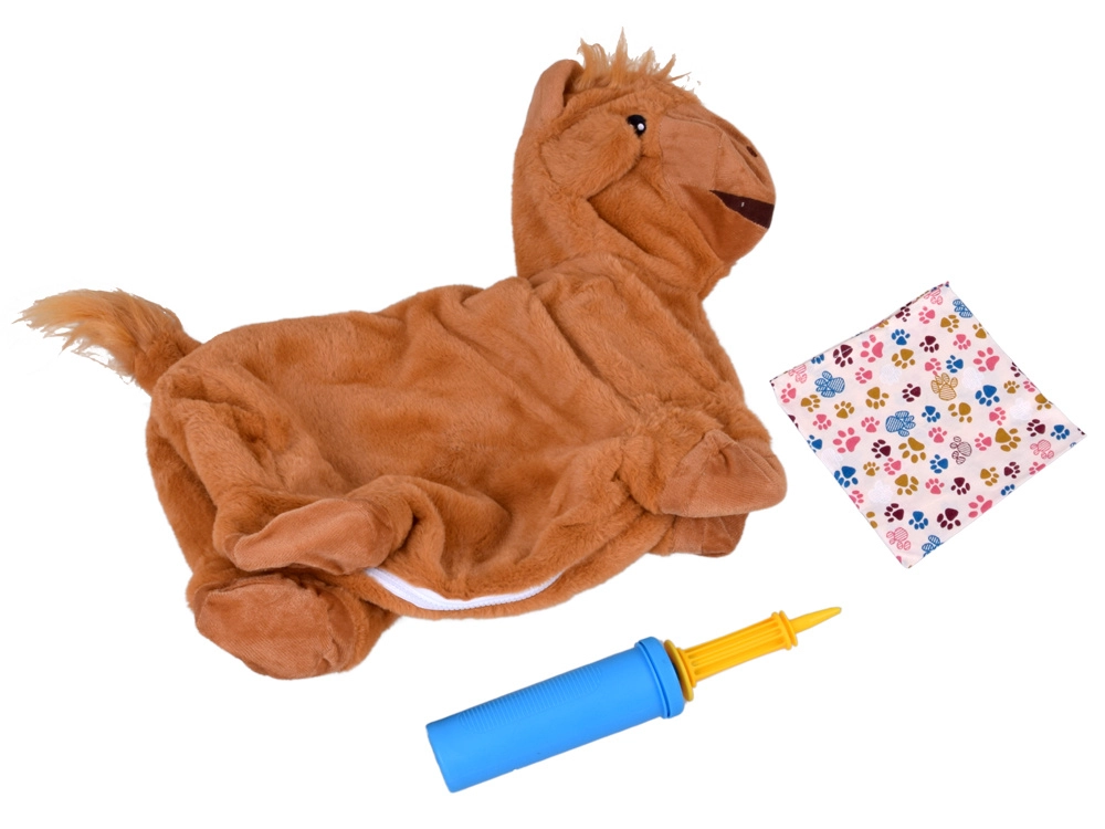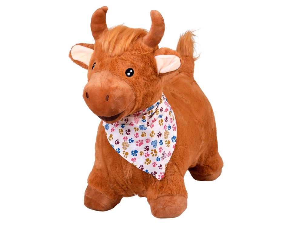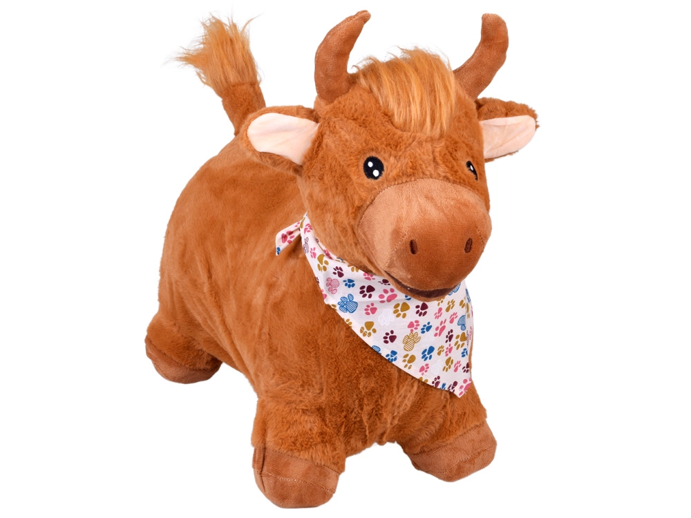 Skákací býček je príjemne mäkký na dotyk, s bezpečne vyšívanými očami, malými rohmi a chlpáčikovým chvostíkom. Jednoducho rozopnite zips na brušku, vložte a nafúknite pomocou priloženej pumpičky – behom chvíľky je pripravený vyraziť za dobrodružstvom. Šatka s hravou potlačou labiek mu dodáva originálny vzhľad, ktorý deti milujú.