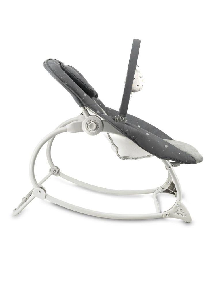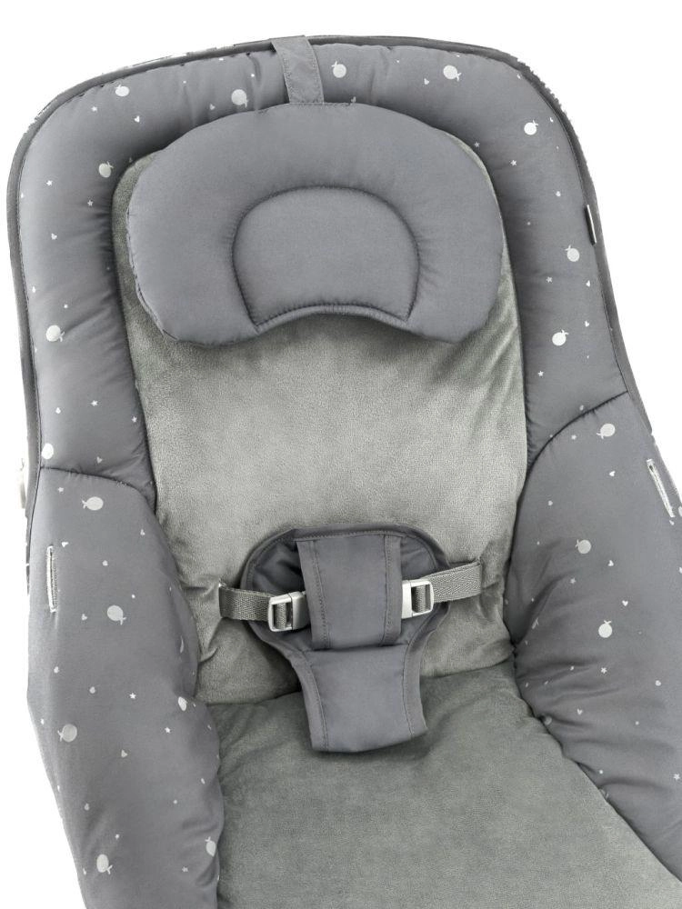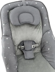 Praktická výbava zahŕňa odnímateľný mäkký vankúšik, snímateľné a prateľné poťahy a možnosť aretácie hojdacej funkcie na pevné usadenie. Pevná a stabilná konštrukcia spolu s 3-bodovým bezpečnostným pásom spĺňa normy EN 12790-2 a EN 71, takže máte istotu bezpečného používania.