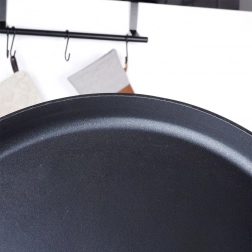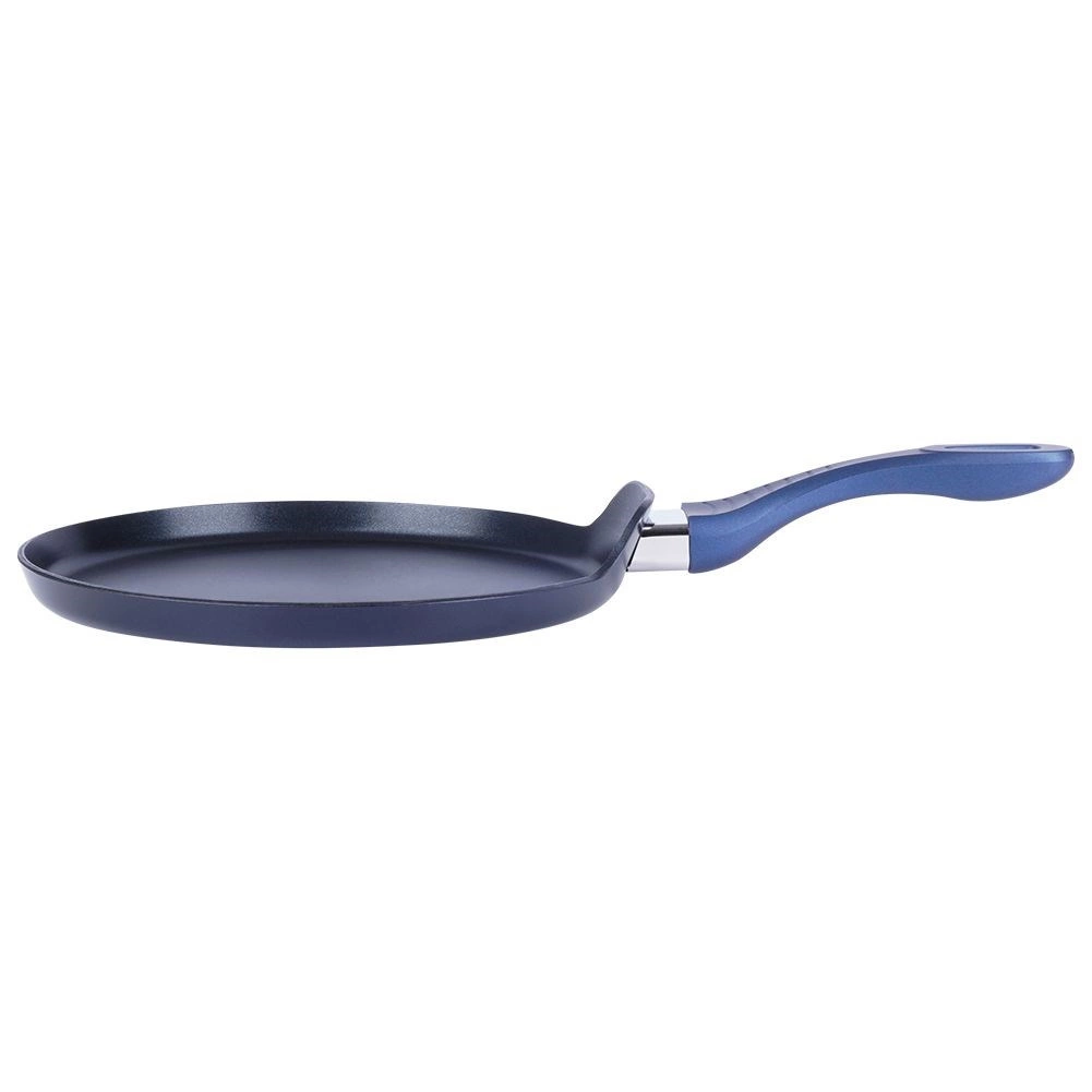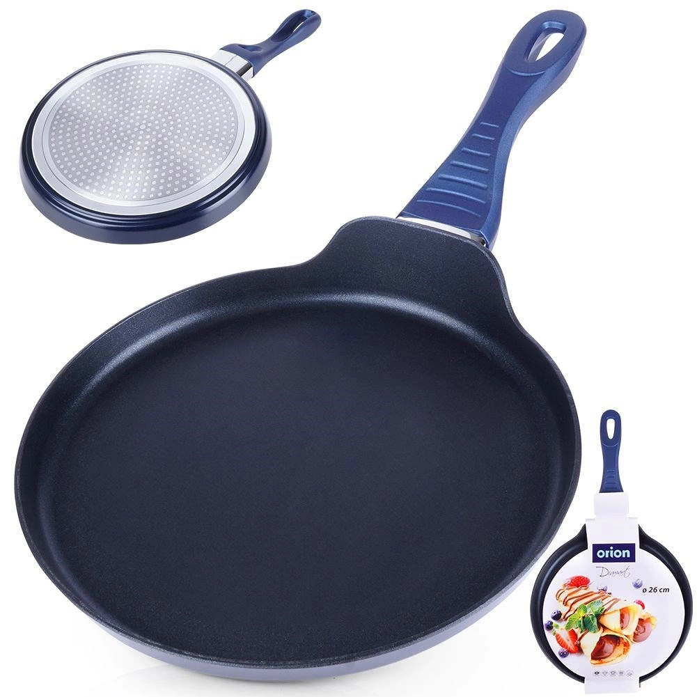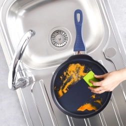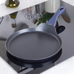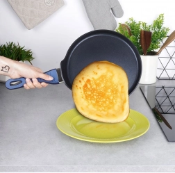 Rukoväť s mäkkým silikónovým povrchom zostáva chladná a pohodlne sa drží. Nízky okraj uľahčuje nalievanie cesta, nadvihovanie aj otáčanie palaciniek. Panvica je bez PFOA a PTFE, odolná voči čistiacim prostriedkom a vďaka indukčnému dnu je kompatibilná so všetkými typmi varných dosiek.