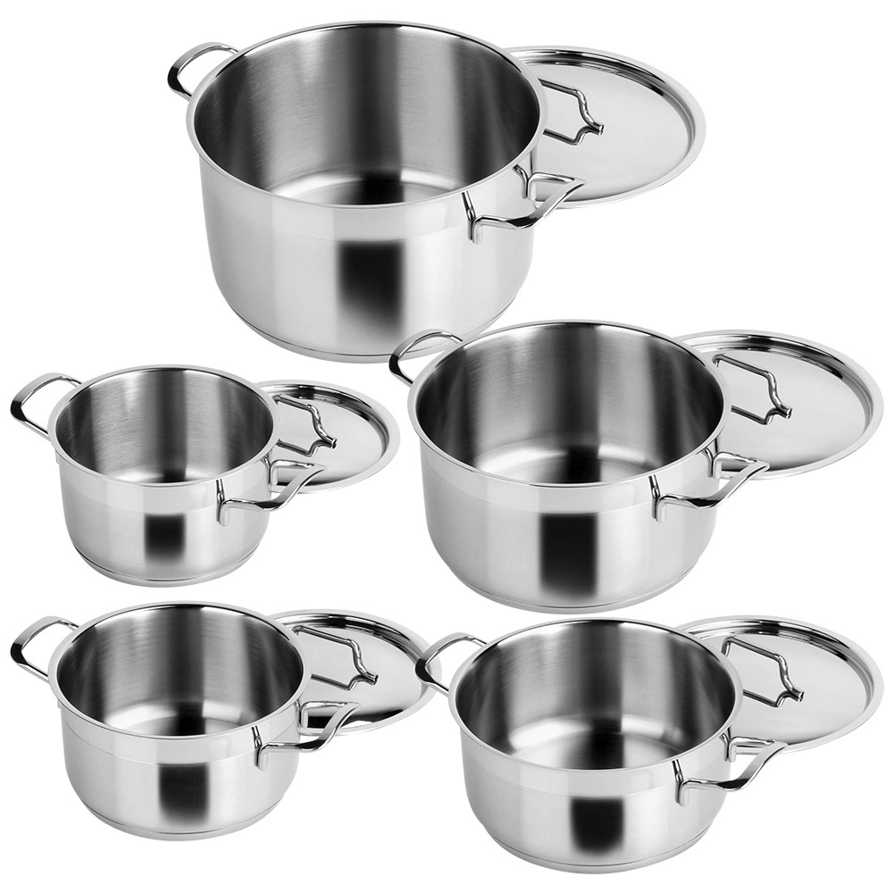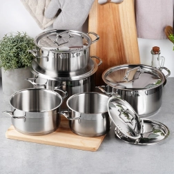Sada ANETT ponúka 10 dielov – päť hrncov s presne padnúcimi nerezovými pokrievkami – v najobľúbenejších veľkostiach pre každodenné varenie, dusenie aj prípravu omáčok a polievok. Kvalitná nehrdzavejúca oceľ 304 (18/10) s matným povrchom a elegantným lesklým lemom zaručuje odolnosť, hygienu a nadčasový vzhľad v každej kuchyni.