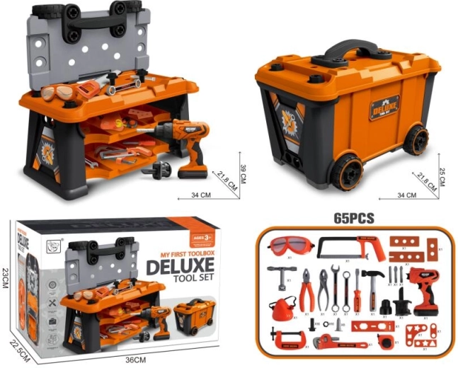 Prenosná dielenská sada pre malých kutilov v praktickom kufríku na kolieskach poteší každého malého staviteľa. Obsahuje až 65 dielov, vrátane detskej vŕtačky na batérie, ochranných okuliarov a príslušenstva. Kompaktné rozmery a šikovné uloženie zaistia ľahké prenášanie a rýchle zostavenie pracovného stolíka kdekoľvek. Ideálne ako hračka na rozvoj kreativity a jemnej motoriky pre deti od 3 rokov.