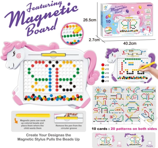 Táto roztomilá magnetická tabuľa s motívom jednorožca je skvelou pomôckou na prvé kreslenie a tréning jemnej motoriky. Deti môžu pomocou magnetického pera vytvárať tvary, obrázky a vzory a kedykoľvek ich jednoducho zmazať a začať odznova. Vďaka šablónam je kreslenie ešte zábavnejšie a intuitívnejšie.