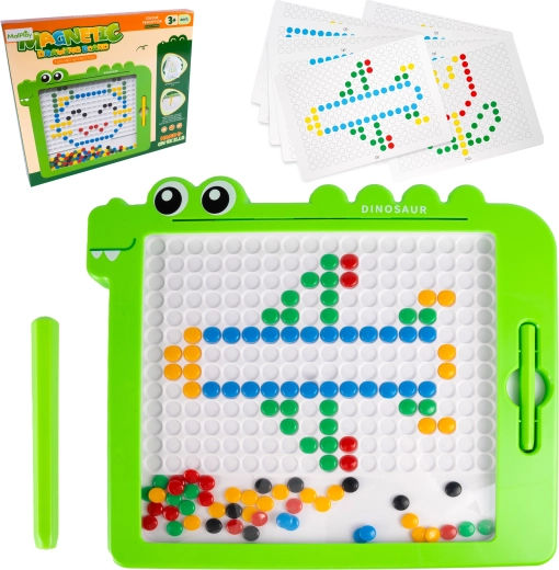 Táto magnetická tabuľa v štýle dinosaura je skvelou pomôckou pre rozvoj detí. Pomocou magnetického pera vyťahujú kovové guľôčky na povrch a vytvárajú tak obrázky, tvary a písmená. Jednoduché vymazanie prebehnutím prsta alebo pera vráti guľôčky späť a zábava môže pokračovať.