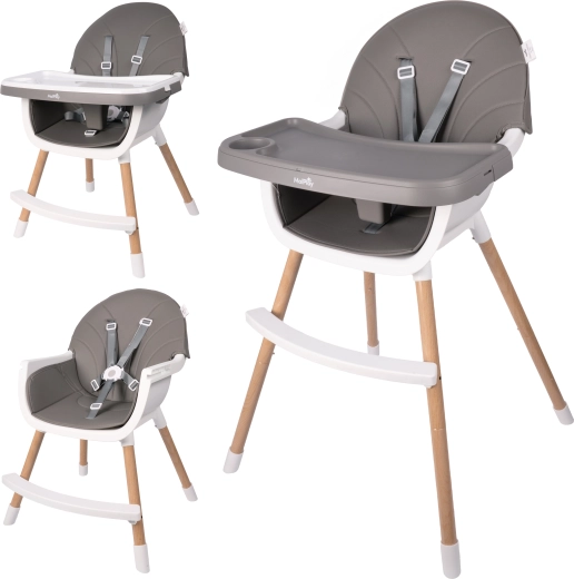 Praktická detská jedálenská stolička BITEO v elegantnej sivej farbe ponúka bezpečné a pohodlné kŕmenie každý deň. Disponuje 5-bodovým bezpečnostným pásom, odnímateľným a výškovo nastaviteľným dvojitým pultíkom, nastaviteľnými nohami a protišmykovými koncovkami. Stabilné oceľové nohy s dekorom dreva dopĺňajú moderný vzhľad a spoľahlivú stabilitu. Súčasťou balenia je podbradník zdarma.