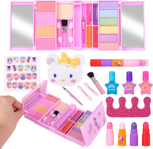 Roztomilá make-up sada v tvare mačiatka poteší malé milovníčky líčenia. Obsahuje pestrý výber líčidiel na kreatívne hranie – od leskov na pery a rúžov po púder, lícenky a sypké tiene. Kompaktná paletka sa dá rozložiť a je ideálna na cesty aj domáce zábavy.