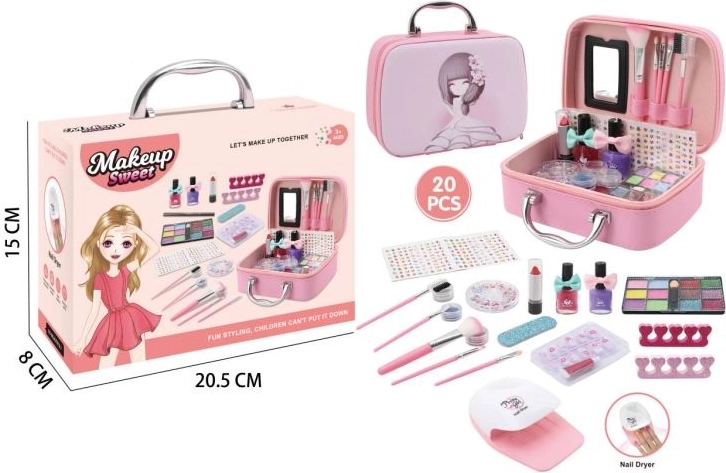 Táto kozmetická sada v elegantnom kufríku je ideálna pre začiatočníkov aj nadšených tvorcov make-upu. Uzavretý kufrík je kompaktný a bezpečne ochráni obsah, po otvorení ponúkne prehľadné usporiadanie pre ľahký výber líčidiel. Vďaka pohodlnému madlu sa kufrík dobre nosí a je vhodný na cesty, do školy aj na návštevy.