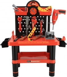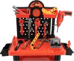 - 1× vŕtačka, 2× kladivko, 1× obojstranný prstencový kľúč, 1× račňa, 1× pílka, 1× skrutkovač s výmenným nadstavcom, 1× nástrčný kľúč, 1× posuvné meradlo, 2× francúzsky kľúč, 1× kliešte, háčiky na zavesenie náradia, samolepky a ďalšie príslušenstvo