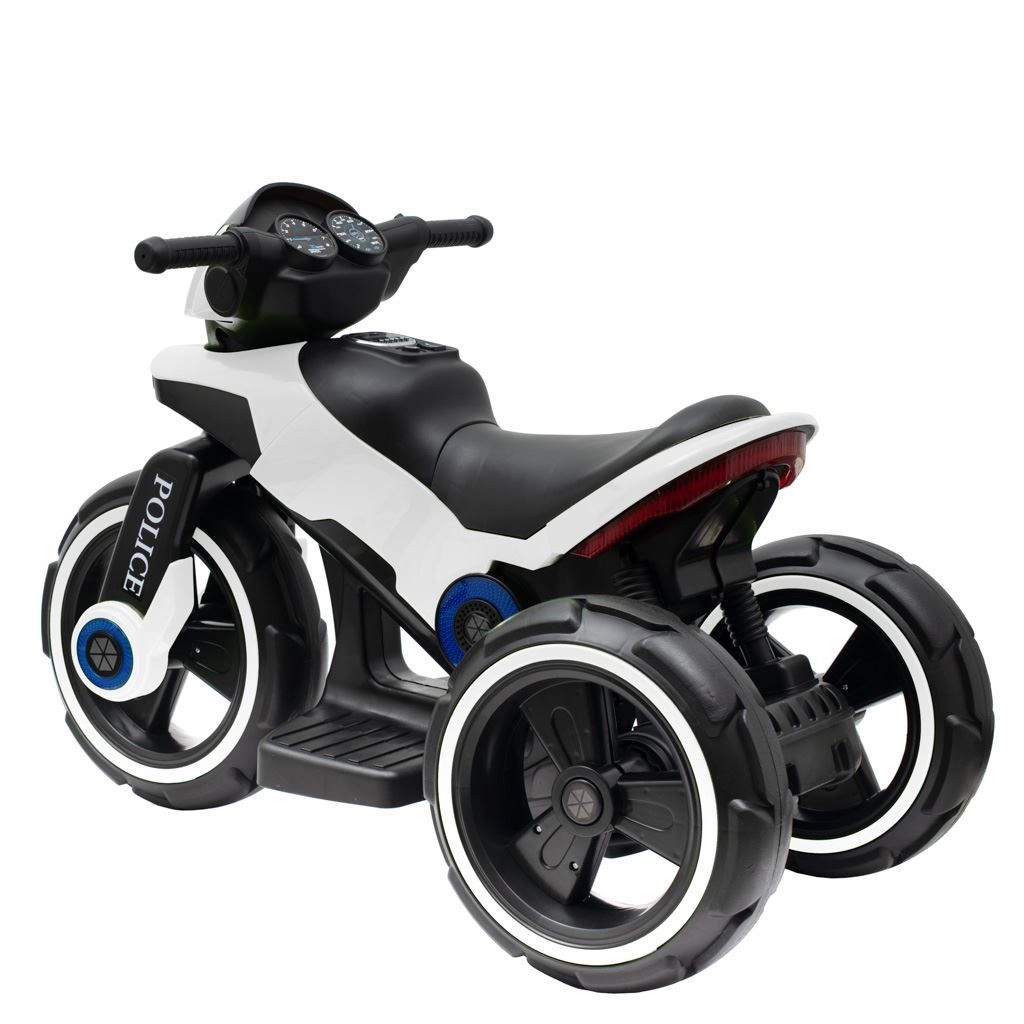 Štýlová detská elektrická motorka BABY MIX POLICE v bielej farbe ponúkne bezpečnú a stabilnú jazdu vďaka širokým kolesám, pohodlnému sedadlu a pohonu oboch zadných kolies. Dva motory 6V/24W zabezpečujú plynulý rozjazd, jazdu vpred aj vzad ovládate prepínačom a brzdenie prebieha uvoľnením pedála. Nechýbajú LED svetlá, zvukové efekty a prehrávanie hudby cez USB/MP3 – ideálna voľba pre malých policajtov od 3 do 7 rokov.