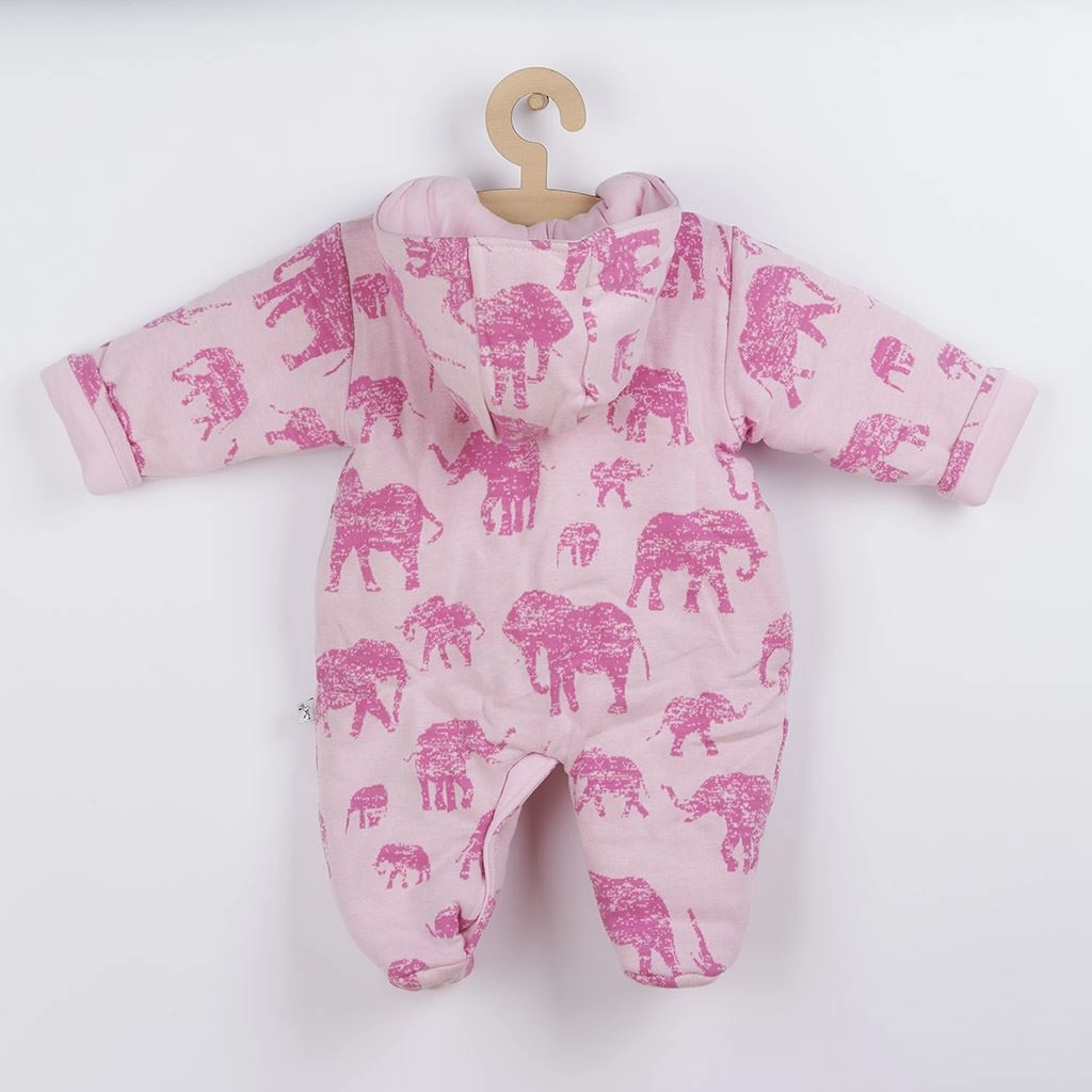 Táto zateplená dojčenská kombinéza je ideálna do chladnejších dní. Príjemný materiál s bavlnenou podšívkou zabezpečuje jemný kontakt s detskou pokožkou, zatiaľ čo antialergická výplň poskytuje spoľahlivé teplo bez podráždenia. Roztomilá potlač slonov a ružové prevedenie poteší každého milovníka nežného dizajnu.
