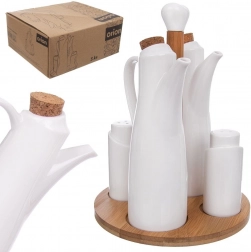 Elegantný porcelánový set na stôl s otočným bambusovým stojanom udrží vaše koreniny aj dochucovadlá prehľadne po ruke. Obsahuje fľaše na olej a ocot, soľničku a koreničku. Porcelánové nádoby sú odolné a ľahko sa čistia, bambusový stojan zaisťuje stabilitu a štýl, korokové zátky udržia čerstvosť oleja a octu a praktické rozmery sa hodia na každý stôl.