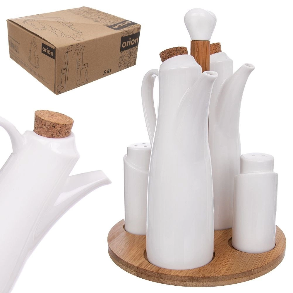 Tento 5-dielny porcelánový set je ideálny na každodenné stolovanie aj slávnostné servírovanie. Kombinuje čistý biely dizajn s prírodným bambusom a prináša poriadok aj štýl do vašej kuchyne. Vďaka korokovým zátkam zostanú vaše oleje a octy dlhšie svieže a porcelán môžete bez obáv umývať v umývačke.