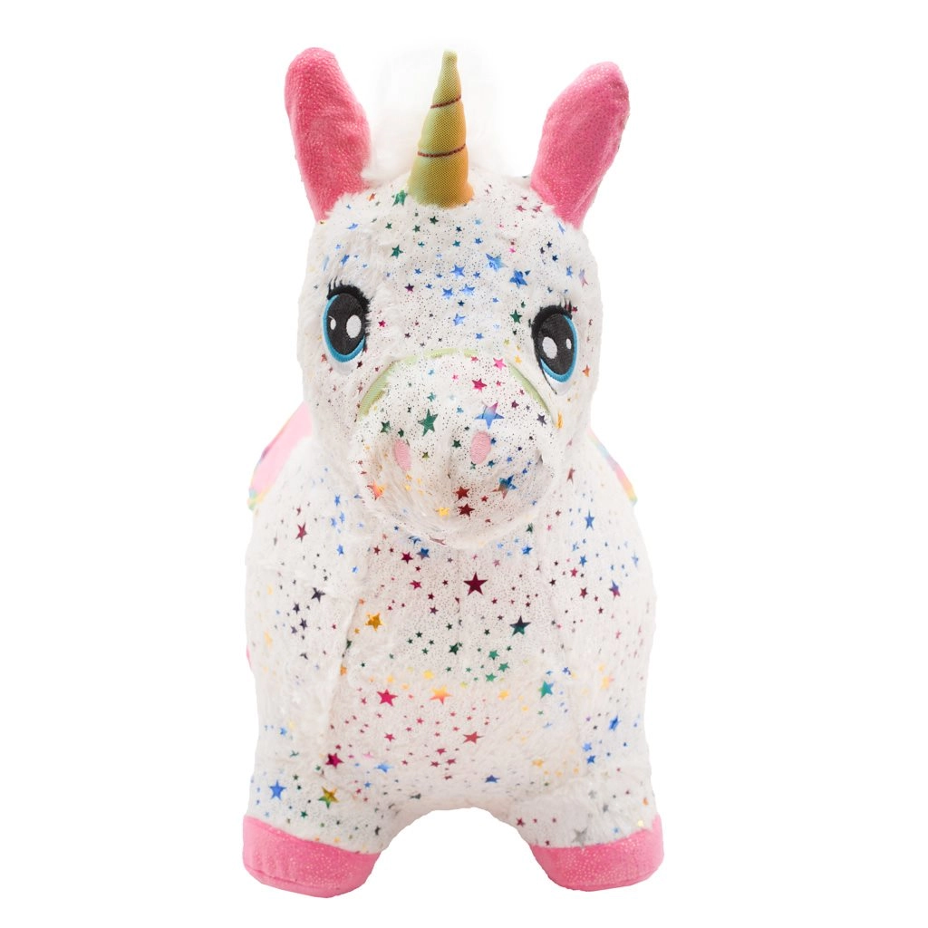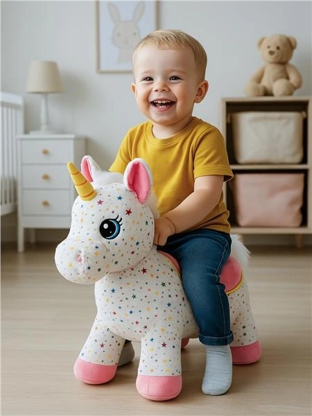 Plyšový skákací jednorožec PLAYTO spája radosť z pohybu s pohodlím. Nafukovacie telo je potiahnuté jemným plyšom, ktorý je príjemný na dotyk a láka k mojkaniu. Po stlačení medzi ušami sa ozve realistický zvuk koníka, ktorý podporí fantáziu a interaktívnu hru.
