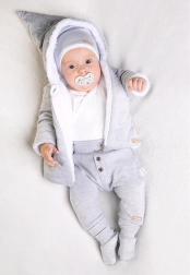 Praktická kapucňa a ohrnovacie rukávy chránia pred chladom, zatiaľ čo predĺžený zadný diel udržiava chrbát v teple. Zips po celej dĺžke uľahčuje obliekanie aj vyzliekanie. Súčasťou balenia je jemná bavlnená čiapočka, ktorá dopĺňa outfit a chráni citlivú pokožku.