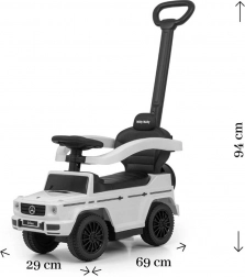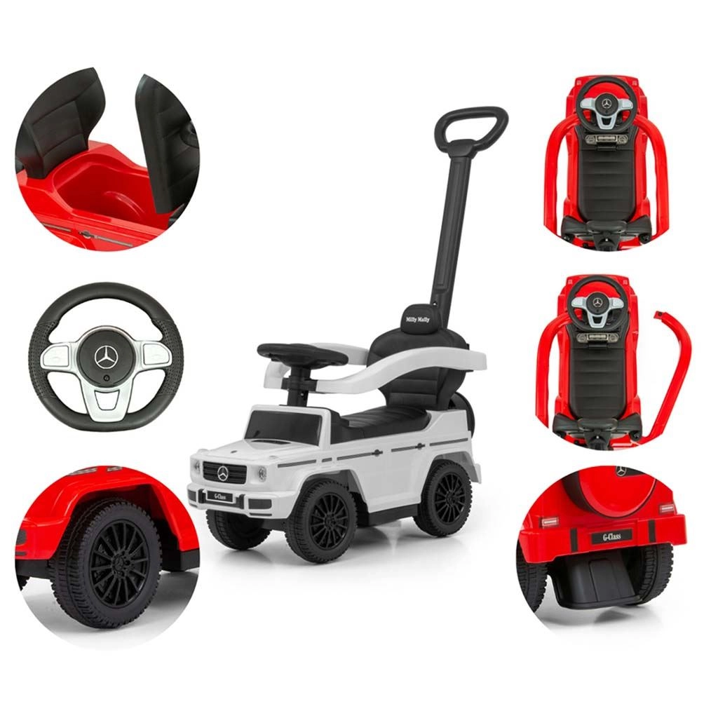 Štýlové detské odrážadlo s licenciou MERCEDES inšpirované modelom G‑Class prináša bezpečnú jazdu a množstvo zábavy pre deti od 12 do 36 mesiacov. Ponúka vodiaciu tyč pre rodičov, otočné predné kolesá, široké sedadlo s úložným priestorom a zvukové efekty na volante. Vďaka odnímateľným bočným opierkam, stúpadlám a tyči sa ľahko zmení z vozíka s doprovodom na samostatné odrážadlo.