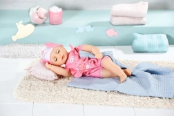 Táto unikátna bábika je oblečená do ružových plaviek, ktoré sú ozdobené modrými švami a hravými volánkami. Plavacia čiapka je vyzdobená obrázkom veselej kúpajúcej sa ovečky, čo dodáva bábike osobitý vzhľad.