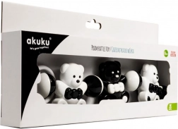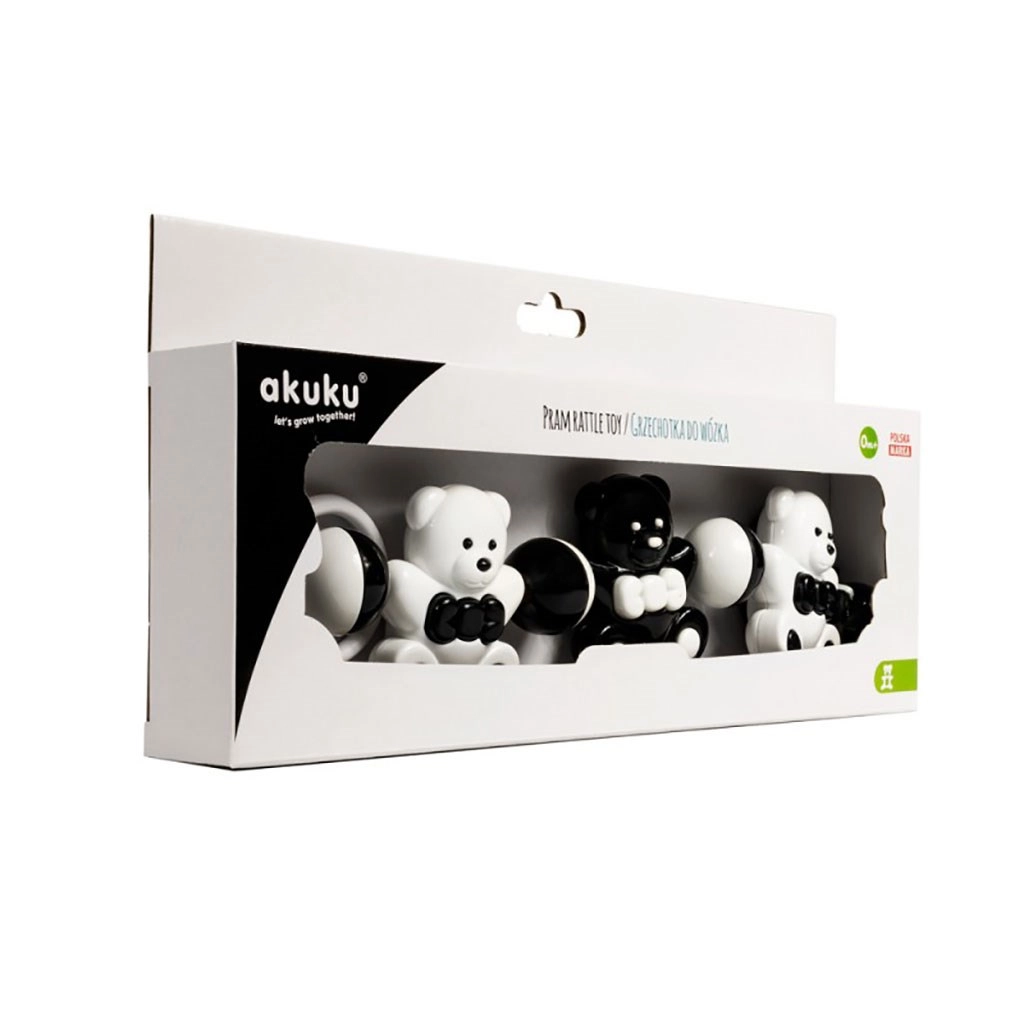 Čiernobiela hrkálka Akuku s medvedíkmi je navrhnutá pre najmenšie deti, ktorým pomáha rozvíjať zrak, sluch aj motoriku. Kontrastné farby zaujmú bábätko, jemné hrkanie upokojuje a stimuluje zmysly. Hračka je ľahká, príjemná na dotyk a ľahko sa udržiava v čistote.