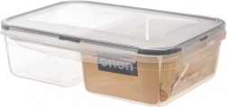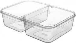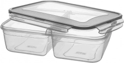Transparentné prevedenie umožní rýchlu kontrolu obsahu bez otvárania. Robustná konštrukcia a silikónové tesnenie vo veku zaistia, že omáčky ani šťavy neuniknú. Dve samostatné oddiely sú ideálne na šalát a prílohu, ovocie a snack alebo obed do práce či školy.