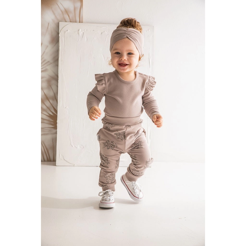 Roztomilé dojčenské tepláčiky z mäkkej bavlny s elastanom na pohodlie každý deň. Majú celoplošný vzor, široký sťahovací lem v páse a pružné lemy na nohavičkách pre perfektné prispôsobenie a držanie.