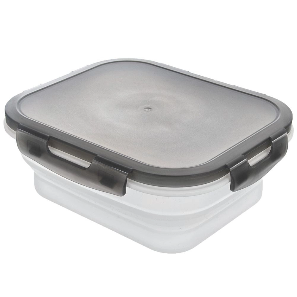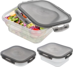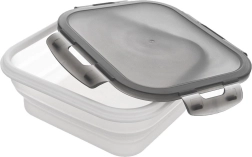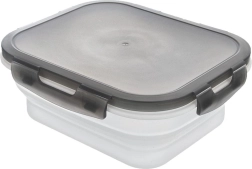 Po zložení má dóza výšku len cca 3,5 cm, po rozložení 7 cm (rozmery cca 19 × 16 × 7 cm). Odolné materiály sú vhodné na kontakt s potravinami, dózu môžete umývať v umývačke a ohrievať v mikrovlnnej rúre bez veka. Skvelé na obedy do práce, snacky na výlety aj skladovanie zvyškov v chladničke.