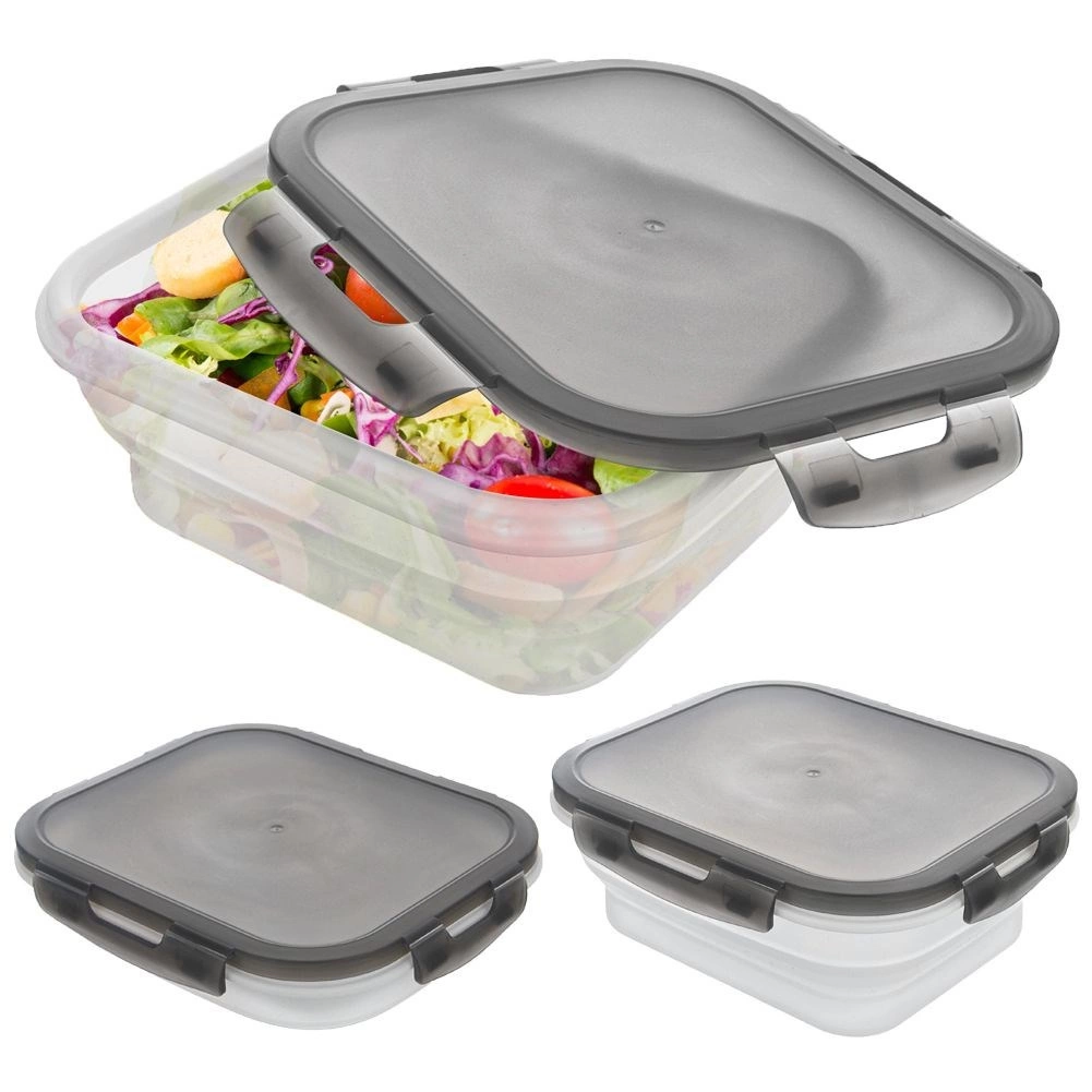 Skladacia silikónová dóza na potraviny s objemom 1 liter je skvelým riešením na každodenné skladovanie aj prenášanie jedál. Veko so silikónovým tesnením a štyrmi klipmi zaisťuje spoľahlivú tesnosť proti úniku tekutín aj zápachov. Priehľadné telo uľahčuje kontrolu obsahu a vďaka skladnosti zaberie minimum miesta v zásuvke, batohu či kabelke.
