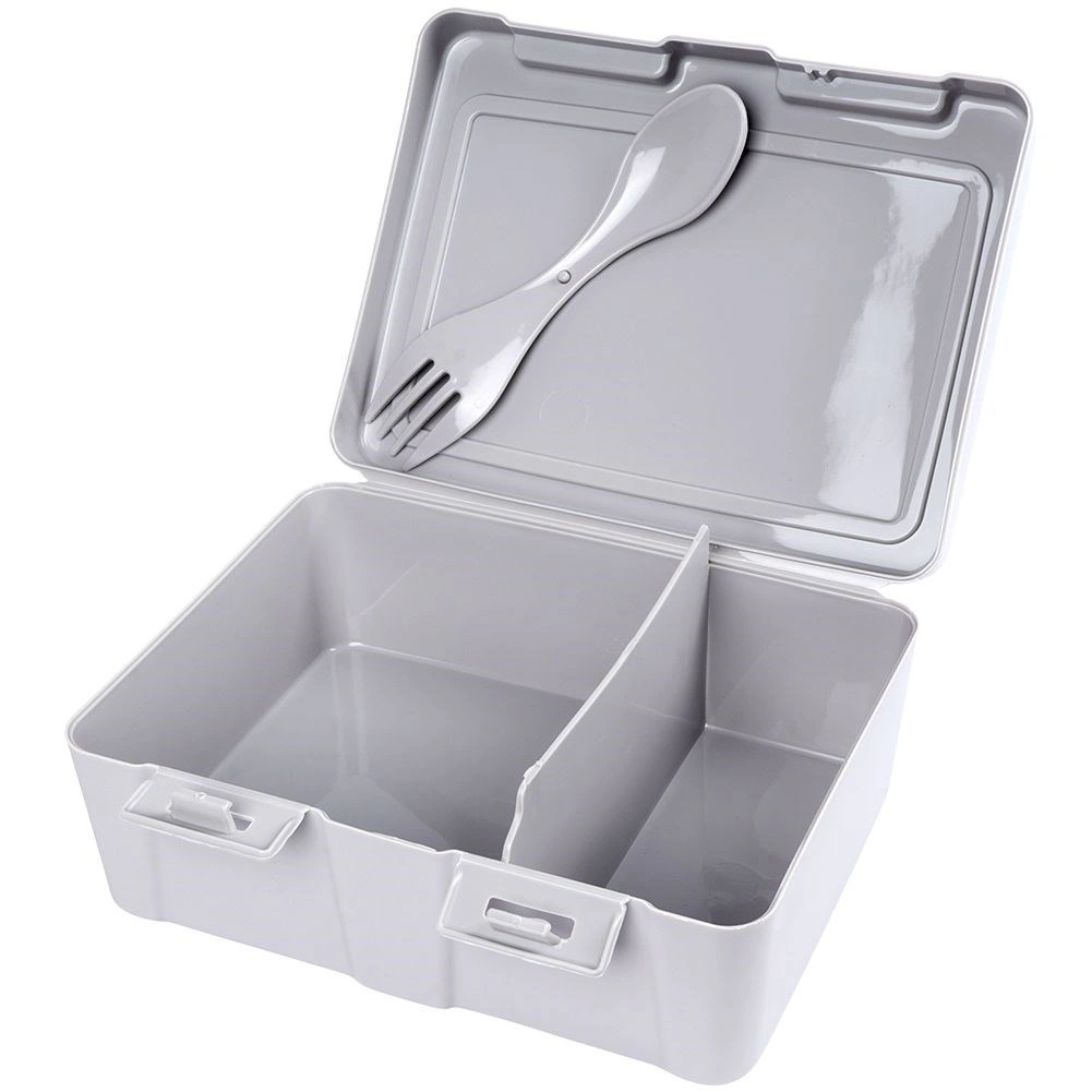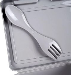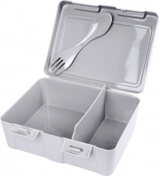 Desiatový box s dvoma priehradkami udrží vaše jedlo prehľadne oddelené a čerstvé. Súčasťou je šikovný príbor 2v1 (lyžička/vidlička) s dĺžkou 14,5 cm, ktorý má svoje vlastné miesto pod vekom, takže ho budete mať vždy po ruke. Odolné prevedenie, kompaktné rozmery a pevné klipy zabezpečujú spoľahlivé uzavretie pri prenášaní.