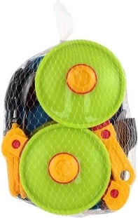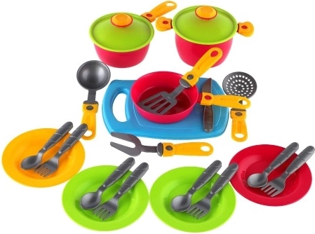 Táto farebná súprava riadu s doskou je perfektná do detských kuchyniek a na hru na varenie. Ľahký, ale pevný plast zabezpečuje bezpečné a dlhodobé používanie, pričom jednotlivé diely sa deťom pohodlne držia.