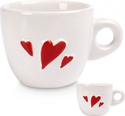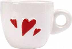 Užite si svoje obľúbené espresso v šálke, ktorá poteší oči aj ruky. Biela keramika s plastickými červenými srdiečkami dodá vášmu stolovaniu romantický nádych, zatiaľ čo kompaktný objem 80 ml zvýrazní bohatú cremu aj arómu kávy.