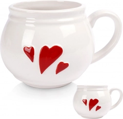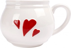 Užite si obľúbený nápoj z pohodlného hrnčeka s nadčasovým dizajnom. Okrúhly „súdokový“ tvar, veľké ucho a lesklá glazúra zaisťujú príjemné držanie aj jednoduché čistenie. Vďaka reliéfnym červeným srdiečkam hrnček krásne doplní vašu stolovú výbavu a ozvláštni každodenné chvíle.