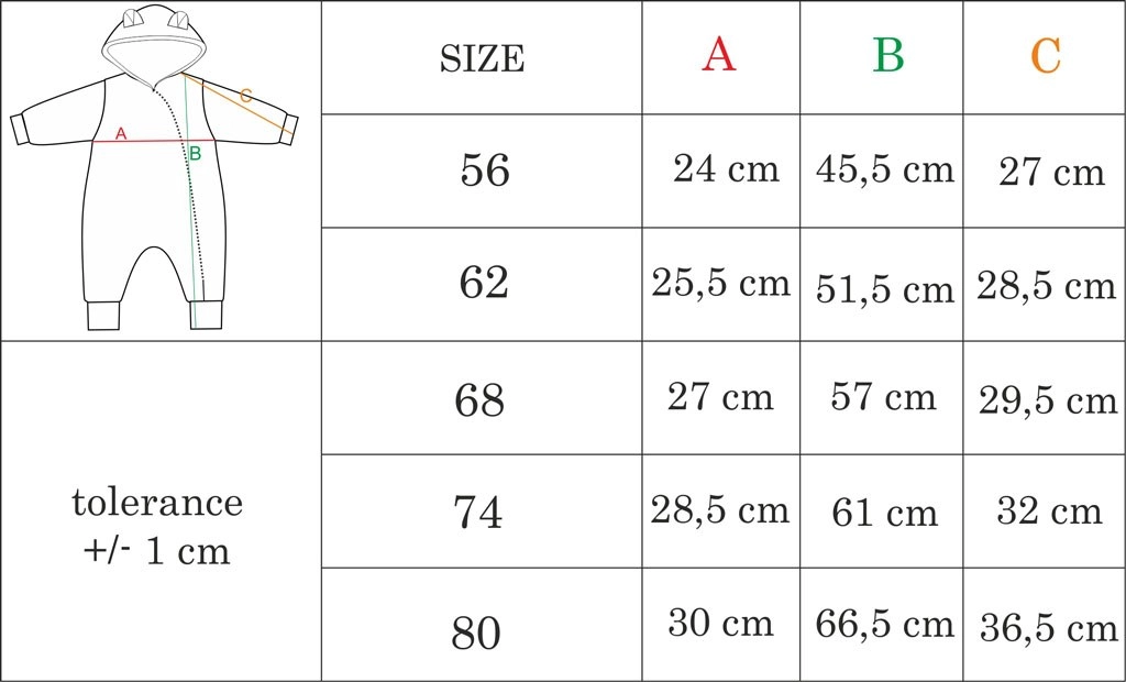 Praktické bočné zapínanie na zips po celej dĺžke uľahčuje obliekanie aj prebaľovanie. Ohrnovacie rukávy umožnia prispôsobiť tepelný komfort a odhalia hrejivú podšívku. Overal je skvelý na jeseň a zimu, na prechádzky aj cestovanie v kočíku.