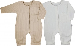 Príjemná bavlnená tkanina s prídavkom elastanu zabezpečuje mäkkosť, priedušnosť a voľnosť pohybu. Overal spoľahlivo udrží chrbátik bábätka prikrytý, čo z neho robí dôležitý kúsok výbavičky pre novorodencov a dojčatá.