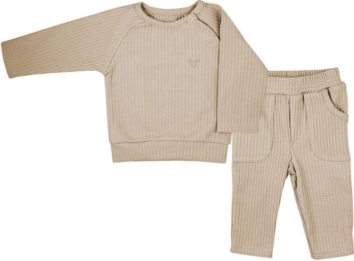 Tričko s dlhým rukávom je vybavené patentkami na ramene pre ľahké obliekanie aj vyzliekanie. Tepláčiky majú širší pohodlný lem a gumu v páse, ktorá netlačí. Dve hlbšie vrecká podčiarkujú trendy dizajn a poslúžia na drobnosti.