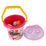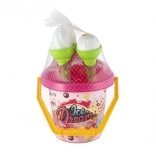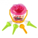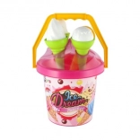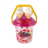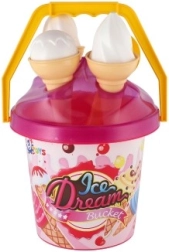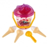 Ľahké plastové vedro s uškom, 3 kornúty a lopatka na zmrzlinu sú perfektné do pieskoviska, na pláž aj do záhrady. Vďaka certifikácii CE je sada vhodná a bezpečná pre najmenších.