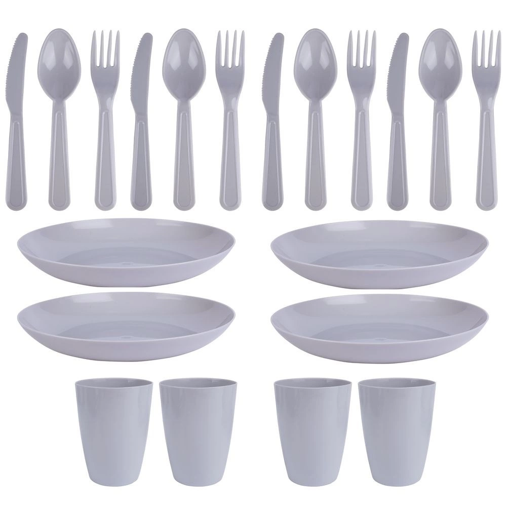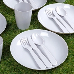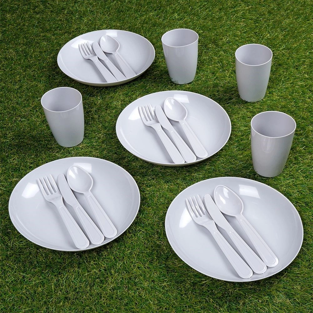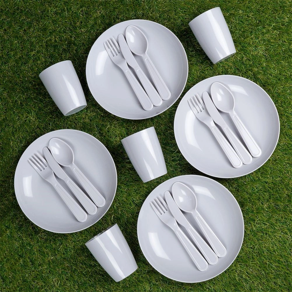 Kompletná plastová pikniková sada pre 4 osoby s celkovo 20 dielmi je ideálna na výlety, záhradu aj kempovanie. Obsahuje štyri poháriky, taniere a príbory. Je ľahká, odolná, bez BPA a viackrát použiteľná – skvelá alternatíva k jednorazovým produktom.