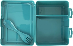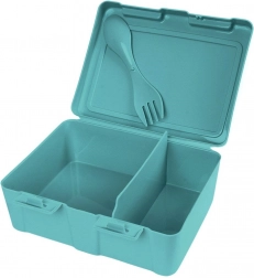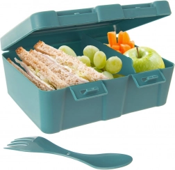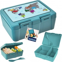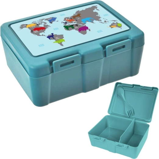 Praktický desiatový box s objemom 1 l s dvoma priehradkami a integrovaným príborom 2v1 (lyžička a vidlička) je ideálny na kanapky, šaláty aj desiaty. Pevné klipy zaistia bezpečné uzavretie, vnútorné rozdelenie bráni miešaniu potravín a kvalitný materiál v matnej tyrkysovej farbe s potlačou mapy sveta so zvieratami poteší deti aj dospelých.