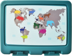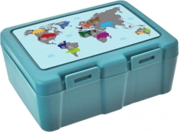 Dve praktické priehradky umožnia oddeliť hlavné jedlo a prílohy či ovocie. Silné bočné klipy bránia nechcenému otvoreniu a vysypaniu obsahu, takže sa môžete spoľahnúť na čistý batoh či kabelku. Atraktívny tyrkysový dizajn s mapou sveta a zvieratami motivuje k zdravším desiatam a teší malých aj veľkých.