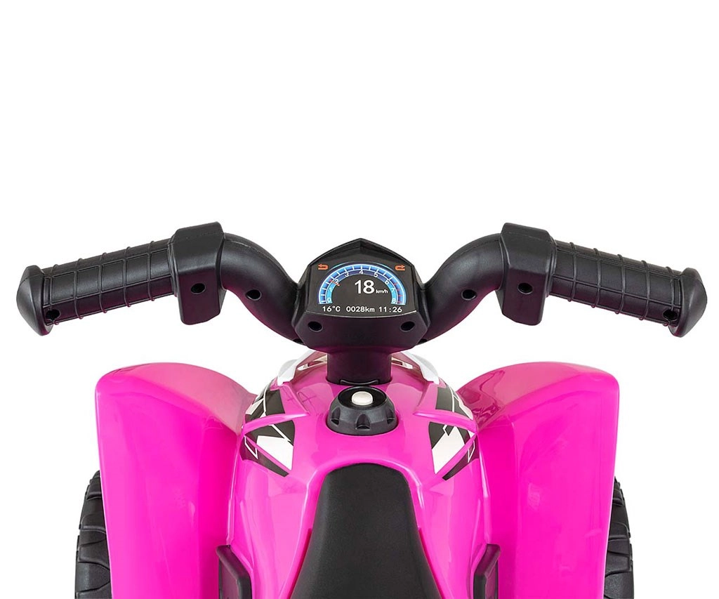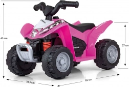 Táto elektrická detská štvorkolka v ružovej farbe prepája športový dizajn a bezpečnú konštrukciu. Vďaka licencovanému vzhľadu HONDA a kvalitnému spracovaniu z odolných materiálov si malí vodiči užijú realistickú zábavu. Po zošliapnutí pedála sa štvorkolka rozbehne a rozsvieti sa predné svetlo, čo umocní zážitok z jazdy.