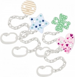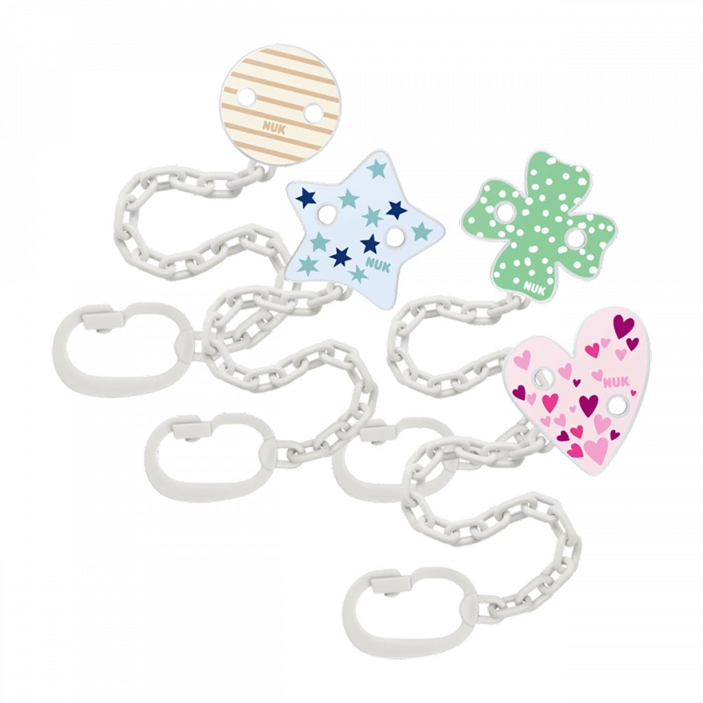 Retiazka na cumlík s klipom NUK je navrhnutá tak, aby udržala cumlík vždy poruke a v čistote. Praktický klip sa ľahko pripne k detskému oblečeniu a drží pevne, takže sa cumlík nestratí ani pri prechádzkach a cestovaní. Pestré farby a veselé motívy rozvíjajú zrakové vnímanie a zaujmú aj tie najmenšie bábätká.