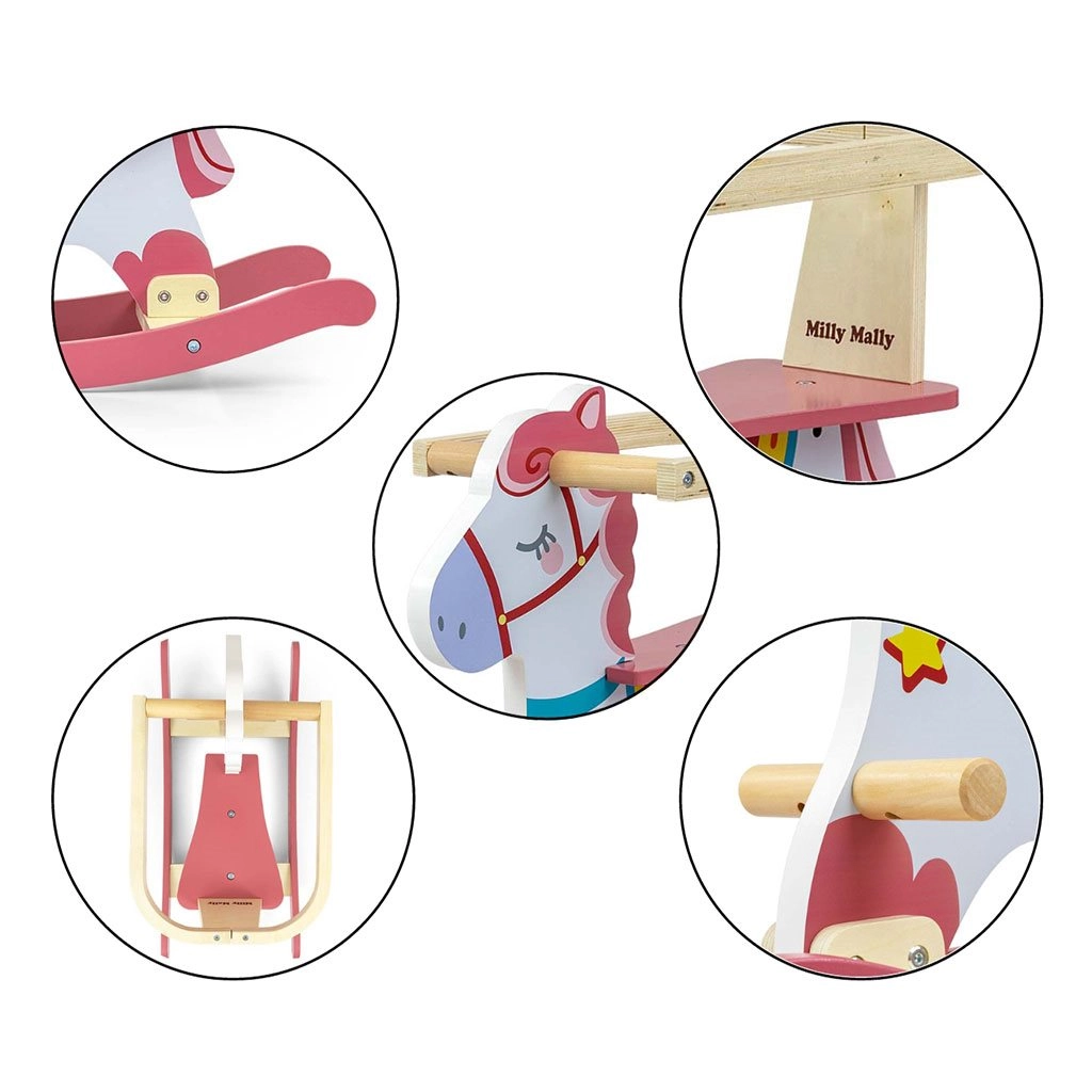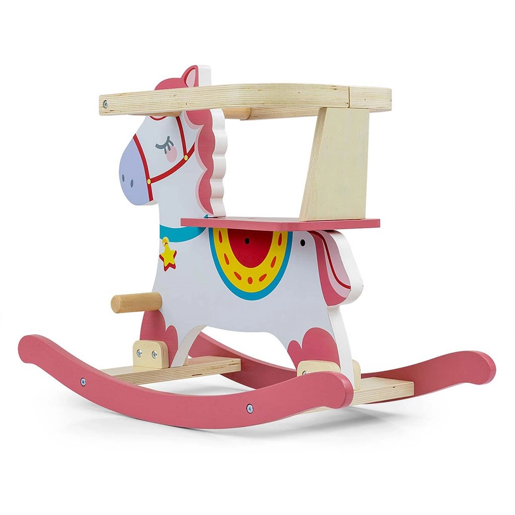Drevený hojdací koník Lucky je ideálna prvá hojdacia hračka pre najmenších. Ponúka stabilnú a bezpečnú konštrukciu, odnímateľné bezpečnostné zábrany, pohodlné rukoväte a opierky nôh a jemne profilované lyžiny pre hladké hojdanie. Vyrobený z kvalitného dreva a lakovaný netoxickými farbami v pastelových odtieňoch.