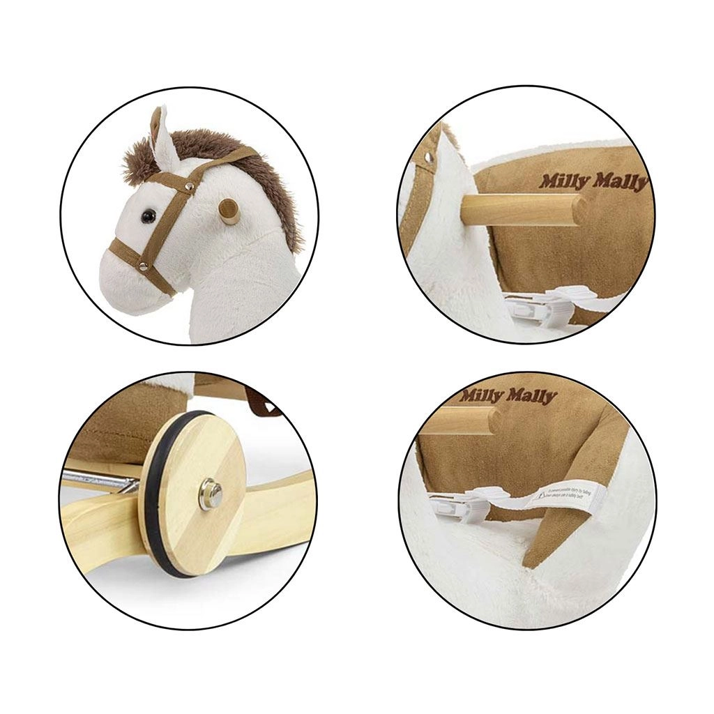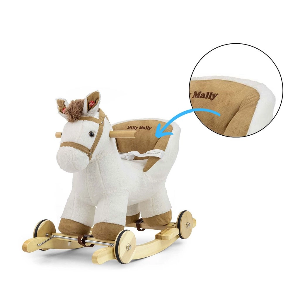 Polly spája dve obľúbené aktivity v jednom – hojdanie a jazdu. Stačí preklopiť jednoduchý mechanizmus na lištách a vysunú sa kolieska, takže z hojdacej hračky je razom odrážací koník. Pohodlné kresielkové sedlo s vysokým operadlom a bezpečnostnými popruhmi drží dieťa isto na mieste, mäkký plyš je príjemný na dotyk a láka k túleniu.