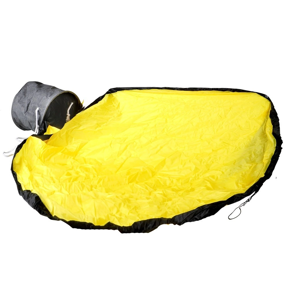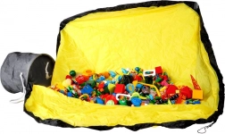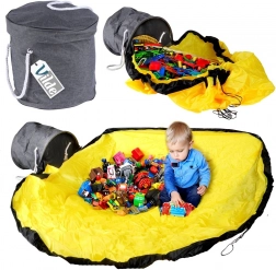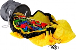 Veľká žltá podložka s čiernym lemom sa po hre stiahne šnúrkou a zmení sa na vak – hračky sa neschovajú pod nábytok a upratané je za minútu.