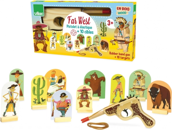 Zažite atmosféru Divokého západu s touto drevenou pištoľou s terčmi od značky VILAC. Hra je ideálna pre deti od 3 rokov a pomáha trénovať presnosť, sústredenie a jemnú motoriku. Stačí natiahnuť gumičku, postaviť terče a začať strieľať – zábava pre celú rodinu.